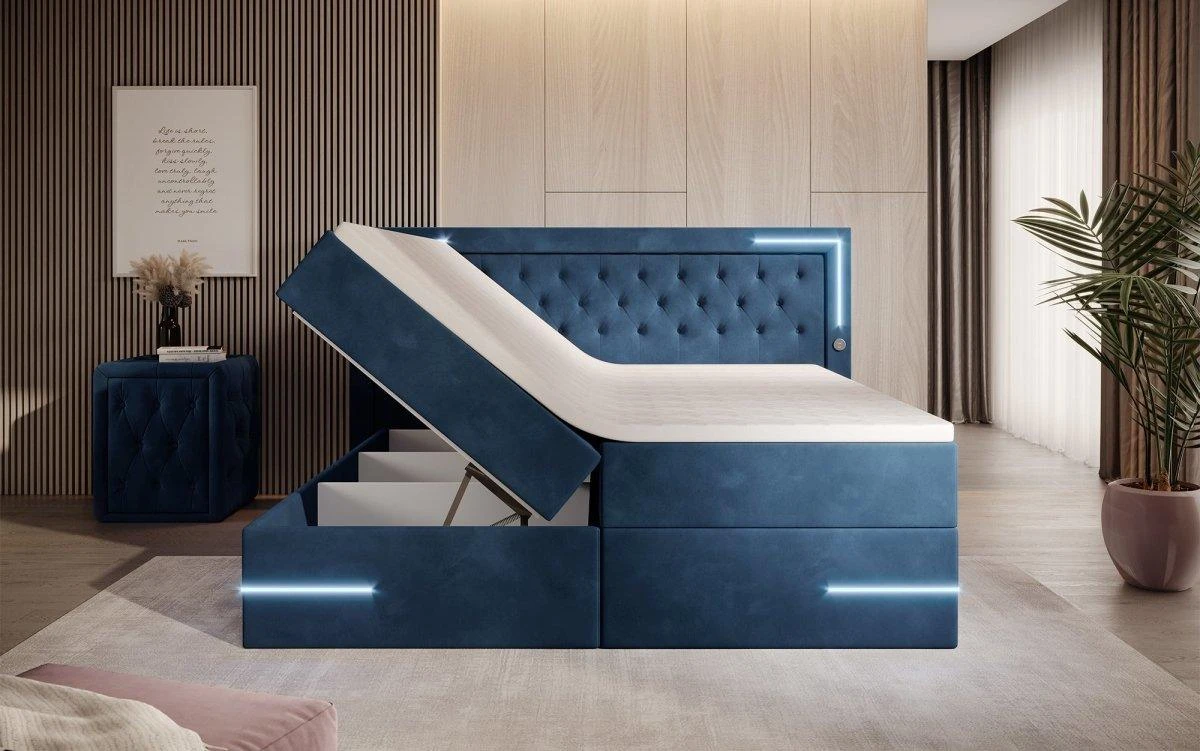 - Langfristige Begeisterung: Dein neues Bett vereint klassische Elemente mit einem futuristischen Look. Ein Bezug aus echtem Samt und die detaillierte Verarbeitung sind lange bewährte Aspekte, auf die du dich heute schon freuen kannst. Aber auch nach Jahren mit demselben Bett wirst du mit Begeisterung auf das Highlight in deinem Schlafzimmer blicken: Blaue LEDs am Kopfteil und an den vorderen Ecken schützen dich nicht nur vor dem schmerzhaften Stoß am kleinen Zeh, sondern verleihen deinem Bett auch ein futuristisches Aussehen. In Kombination mit den Füßen aus Chrom wird dieses Bett auch in vielen Jahren noch mit seiner Modernität begeistern.