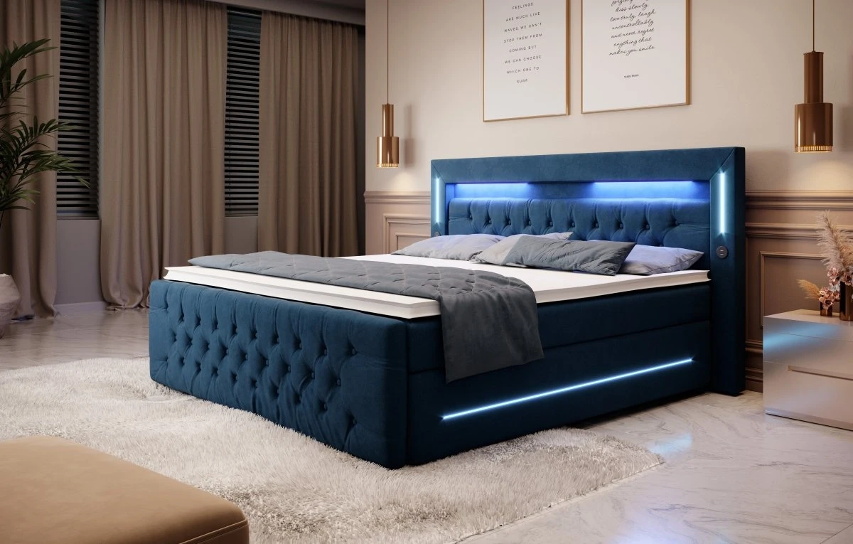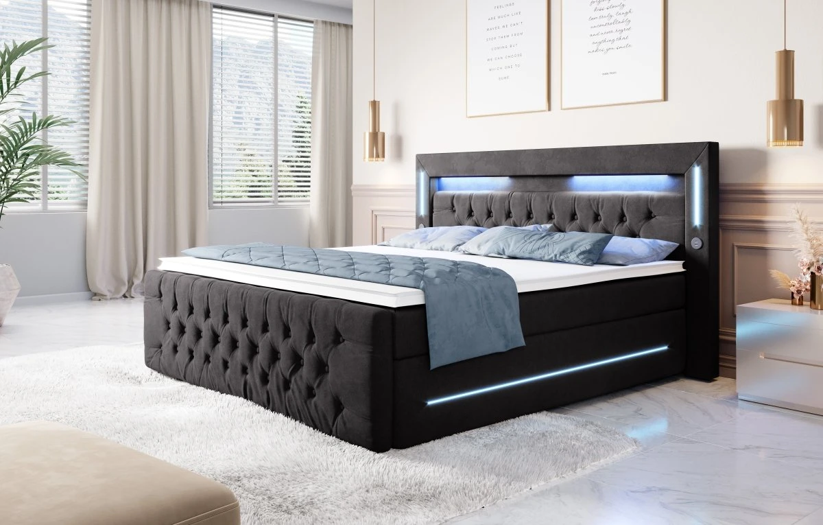 - Praktische Technik: Am Kopfteil und an den Seiten strahlen moderne LED-Leisten. Sie sorgen für eine gemütliche Atmosphäre zum Einschlafen und sind außerdem ein wichtiger Sicherheitsfaktor: Auch nachts kommst du endlich ohne Stolpern und Stoßen aus dem Bett. Abgerundet wird das Technik-Paket durch zwei USB-Anschlüsse an jeder Seite des Bettes. So lädst du deine technischen Geräte ganz ohne Kabelsalat. Das Boxspringbett Moonlight zeigt, dass moderne Technik dein Leben nicht nur schöner, sondern auch komfortabler und sicherer macht.