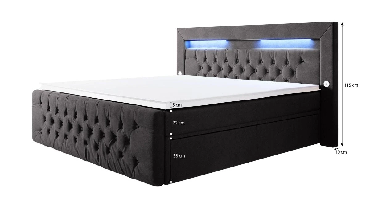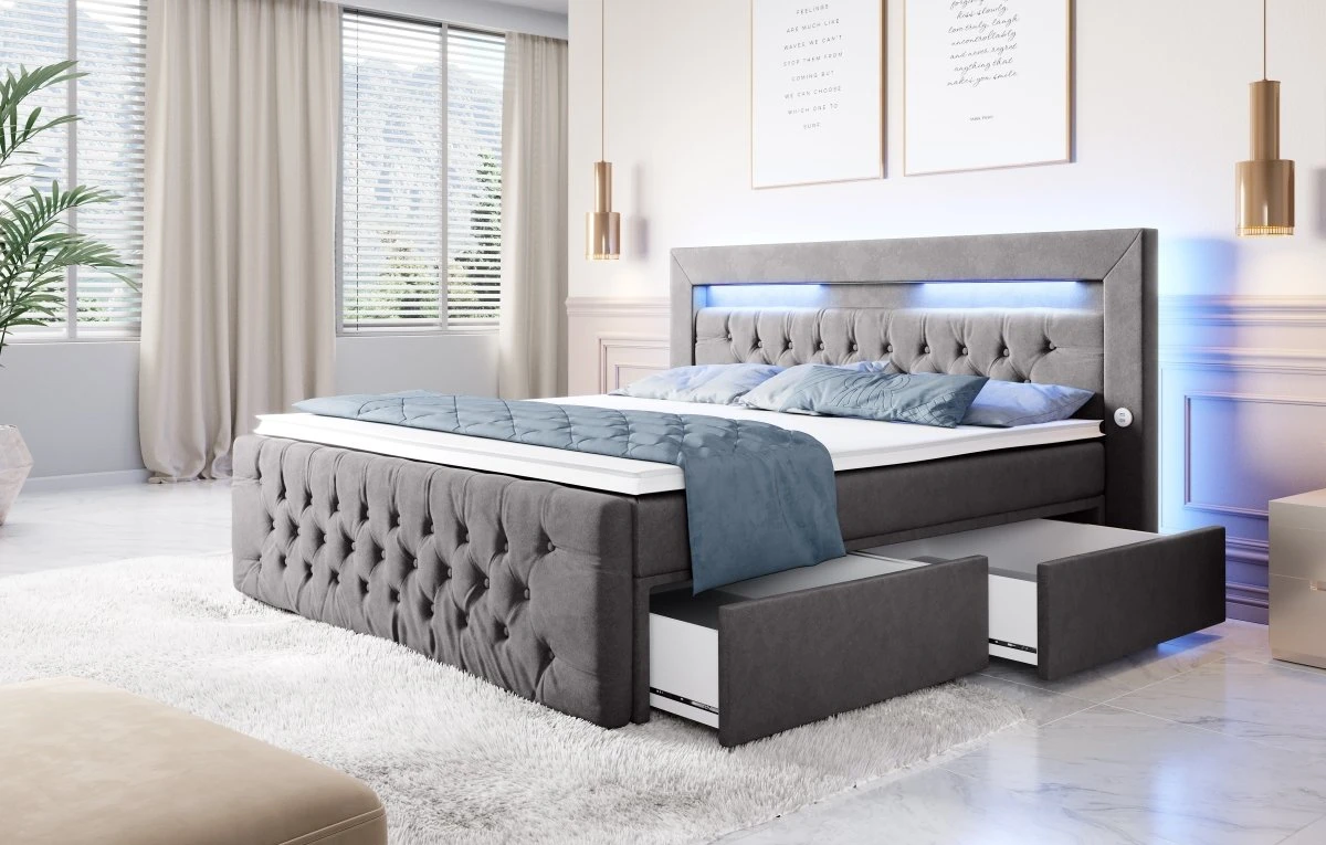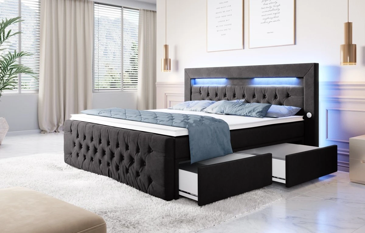 - Ein schönes Schlafzimmer: Wichtig für die Wohlfühlatmosphäre im eigenen Schlafzimmer ist natürlich auch das Aussehen. Das Boxspringbett Sunshine ist mit der eleganten Chesterfield-Optik am Kopf- und Fußteil und einem Bezug aus 100 % Samt eine echte Augenweide. Damit das schöne Möbelstück zu deinem Geschmack und deiner Einrichtung passt, kannst du aus sieben angesagten Farben wählen. Das Modell bereichert dein Schlafzimmer entweder in Grau, Blau, Rot, Beige, Braun, Weiß oder Schwarz. Ganz nebenbei sorgt dein neues Bett auch für mehr Ordnung im Schlafzimmer. Unter der Liegefläche befinden sich zwei geräumige Schubladen. So schaffst du im Handumdrehen strukturierte Ordnung, in der du dich rundum wohlfühlen kannst.
