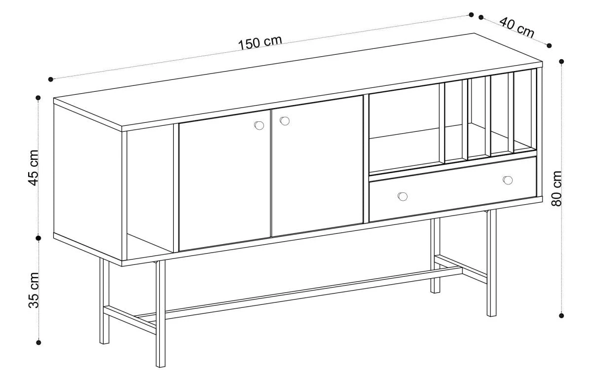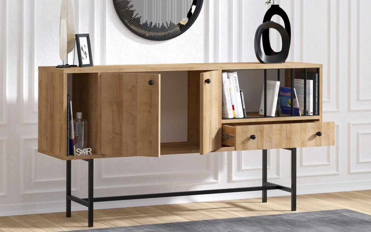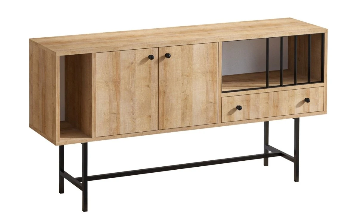 Die Kommode Freya bietet mit ihren vielen Staufächern nicht nur ein praktisches Ordnungssystem, sondern auch eine stylishe Aufteilung: Ein offenes, schmales Regal, ein großzügiger Schrank, eine Schublade und ein großes offenes Fach mit Metallstreben als Bücherhalter – in der Kommode Freya finden alle wichtigen Gegenstände einen Platz. Raum für deine persönliche Dekoration bietet die 150 cm breite, durchgehende Abdeckplatte. Der Korpus aus melaminharzbeschichteten Spanplatten in Eichenoptik wird von einem schwarzen Metallgestell getragen. So entsteht der schlichte und leichte Look.