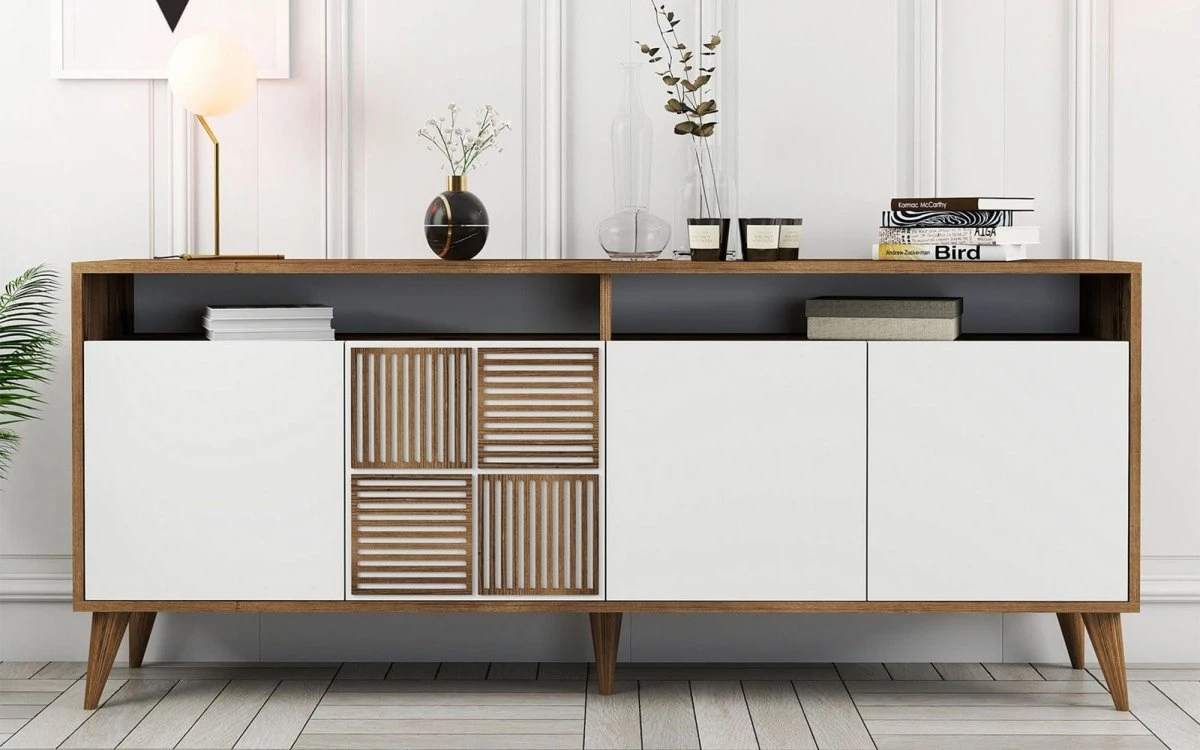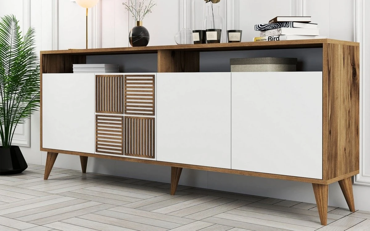 Die Kommode Milan strahlt in angesagtem Retro-Schick. Dunkle Walnussoptik, große verschlossene Fronten und die leicht schrägen Füße waren vor Jahrzehnten genauso beliebt wie heute. Bei diesem Modell legst du den Retro-Faktor aber selbst fest: Möchtest du die dunkle Version mit durchgehender Walnussoptik? Oder möchtest du mit weißen Fronten einen stylishen Akzent zum dunklen Korpus setzten? Bei der weißen Alternative kommen auch die aufgesetzten Details in Walnussoptik eindrucksvoll zur Geltung.