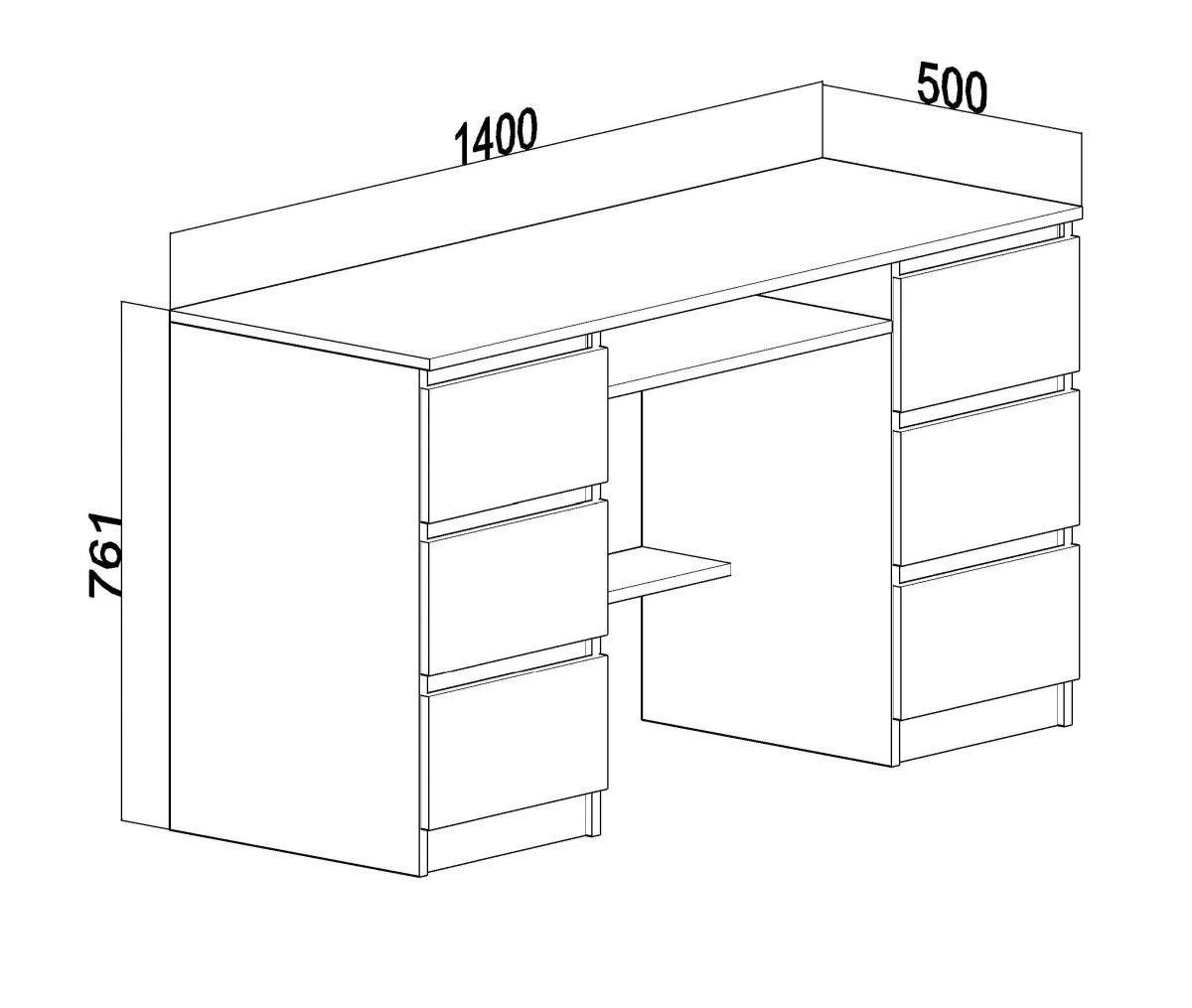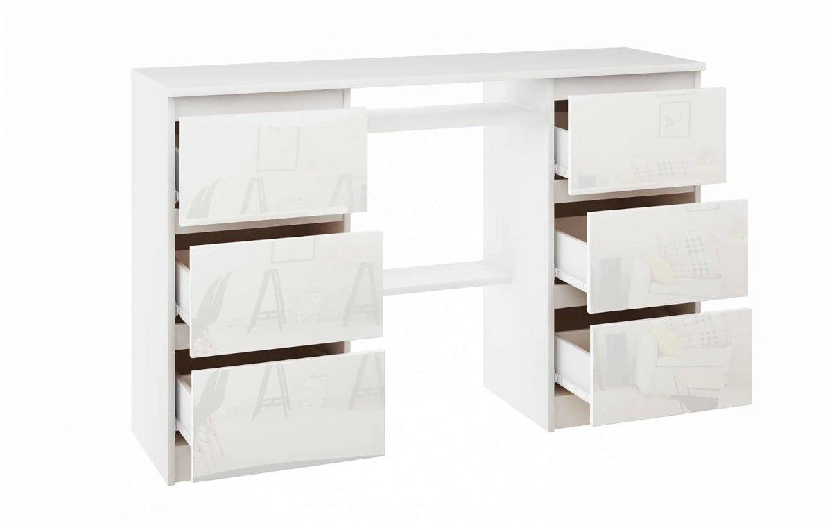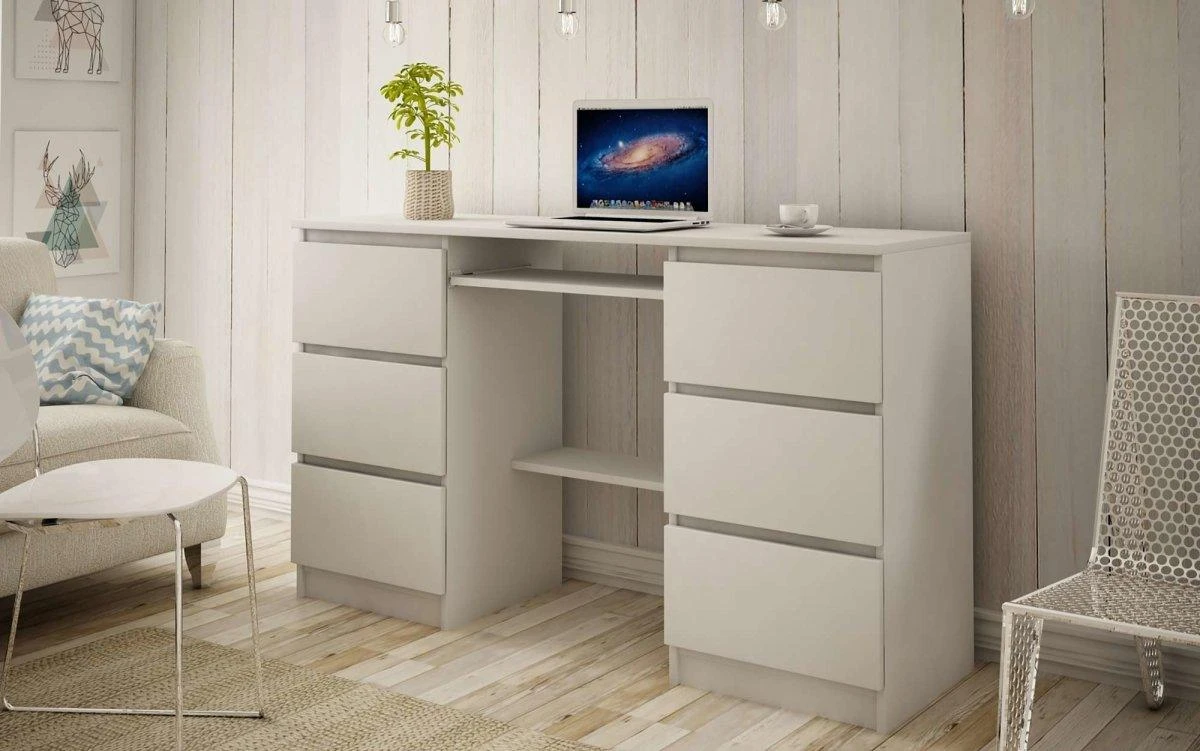 Dieser Schreibtisch vereint Style und Praktikabilität. Mit den schneeweißen Fronten und Schubladen ohne Griff strahlt er eine schlichte Eleganz aus. Gleichzeitig bietet er viel Platz auf und unter der Tischplatte: Auf einer Breite von 140 cm finden mehrere Bildschirme, eine Tastatur und zusätzliche Unterlagen ihren Platz. In den sechs Schubladen in beiden Tischbeinen kannst du alles verstauen, was nicht auf den ersten Blick sichtbar sein soll.