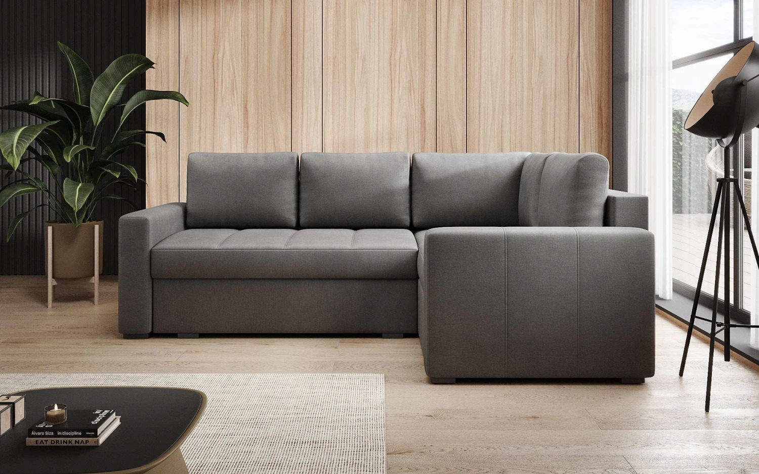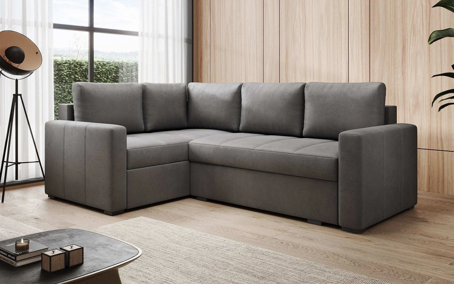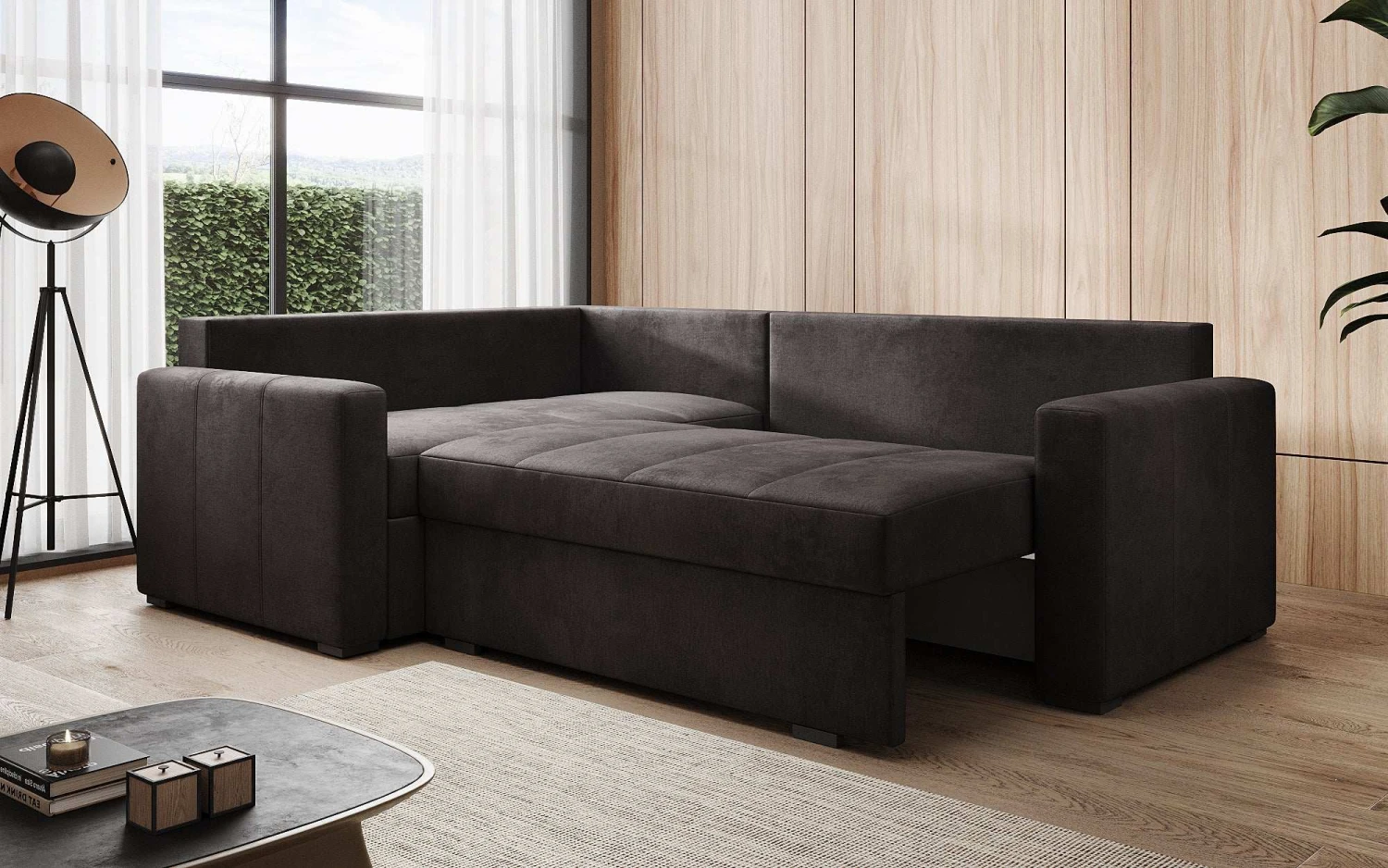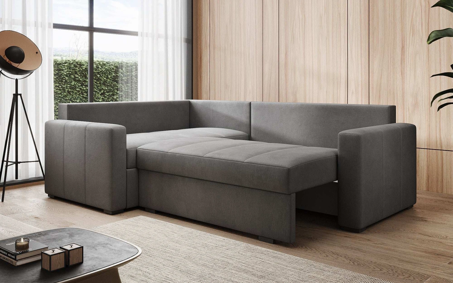 Das Cortino Ecksofa ist ein vielseitiges Möbelstück, das sowohl tagsüber als auch nachts höchsten Komfort bietet. Bei Bedarf kann das Sofa mit dem ausziehbaren Unterboden aufgeklappt werden und bietet eine Liegefläche von 195 x 135 cm sowie einen großzügigen, tiefen Stauraum für Bettwäsche.
