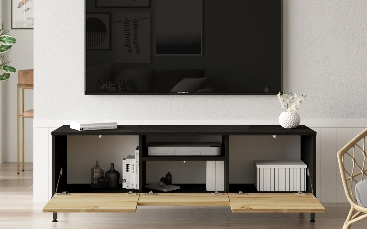 Das TV-Lowboard Cortino bringt Ordnung in dein Wohnzimmer. Die drei verschlossenen Schränke sind der ideale Raum, um Spiele, Kisten und Zubehör geschickt vor neugierigen Blicken zu schützen. Aber auch die Form des TV-Lowboards selbst sorgt für einen aufgeräumten Eindruck. Klare Kanten, dezente Füße und symmetrische Formen verbreiten eine moderne und ordentliche Atmosphäre. Damit dieser Ordnungshüter perfekt zu deinem Stil passt, stehen dir zwei Optionen zur Auswahl: Das schwarze Gestell und den schwarzen Rahmen kombinierst du entweder mit Fronten in natürlicher Eichenoptik oder in zurückhaltendem Silber.
