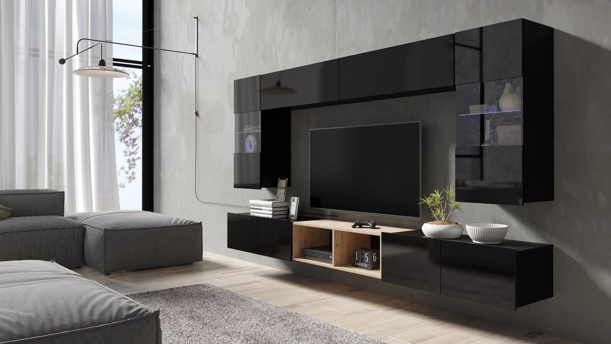 Geschlossene Fächer, beleuchtete Glasvitrinen und offene Regale – die Schrankkombination Picasso verbindet die unterschiedlichen Elemente zu einer luftigen und praktischen Lösung. Wie ein Bilderrahmen wird die Schrankwand um den Fernseher gebaut. So wird der Platz effizient genutzt und gleichzeitig ein echter Hingucker im Wohnzimmer geschaffen. Dank der vielen Staufächer kannst du Spiele und Bücher unsichtbar verstauen, Sammlerstücke und Familienfotos in Szene setzen und Spielekonsolen und Fernbedienungen leicht zugänglich verräumen. Das Möbelstück in Schwarz oder Weiß mit einem offenen Regal in Naturholz-Optik wird also allen Ansprüchen an einen modernen Ordnungshüter gerecht.