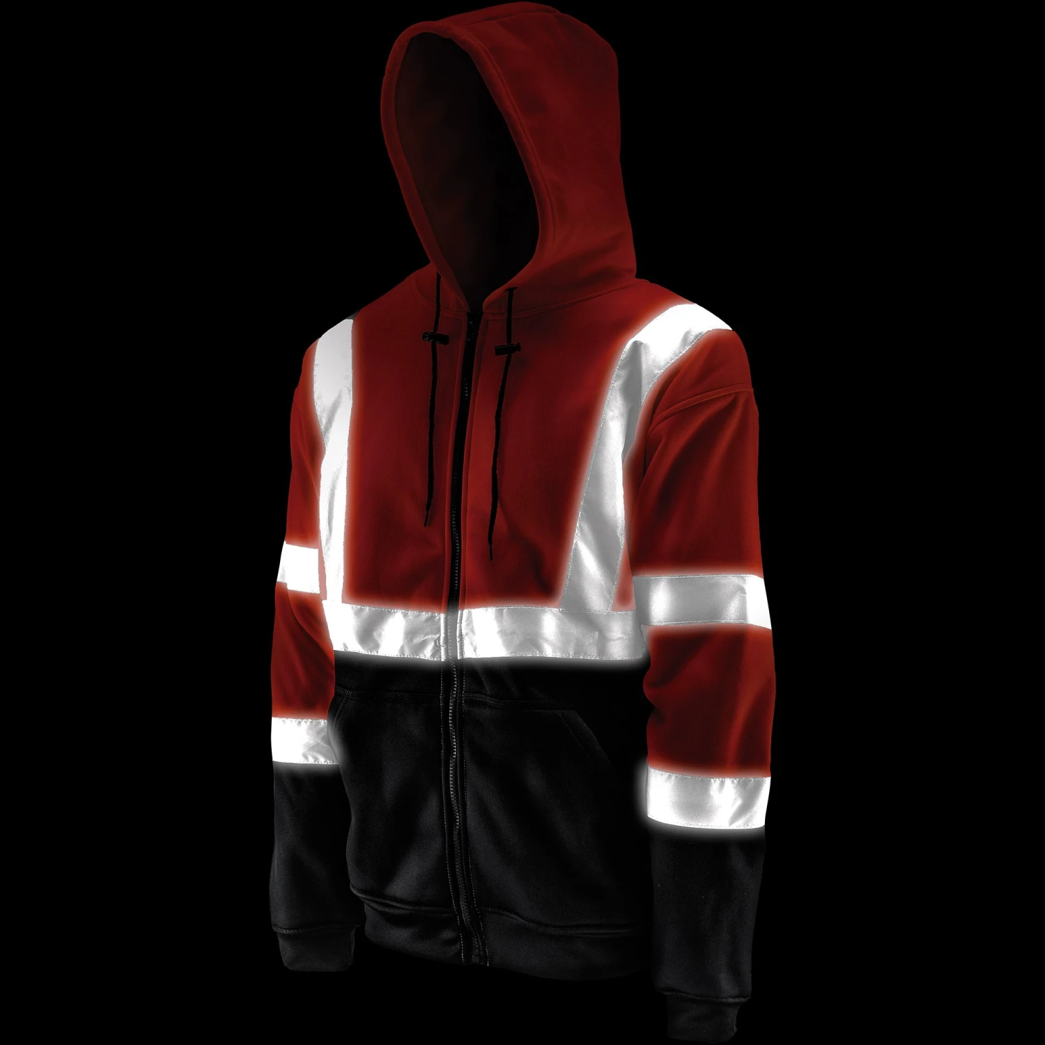 The Hi-Viz Hoodie is designed to keep you warm and visible while working on chilly days. It features 2” width reflective tape for increased visibility and an adjustable drawstring hood.