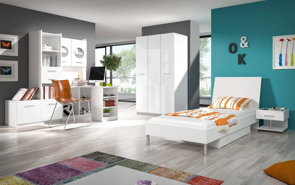Dieses zeitlose 5-teilige Kinderzimmer wird Ihren Nachwuchs bis ins Teenager-Alter begeistern. Die Schreibtischkombination bietet zusammen mit dem Regalaufsatz viel Platz für Bücher und alle Schulunterlagen. Ein weiteres Regalelement mit breitem Unterschrank sorgt für zusätzlichen Stauraum. Die trendigen Hochglanzfronten können aus 7 attraktiven Farbvarianten gewählt werden. Von puristischem Weiß über mädchenhaftes Rosa oder frisches Türkis bis hin zu coolem Grau, es ist für jeden Geschmack etwas dabei.